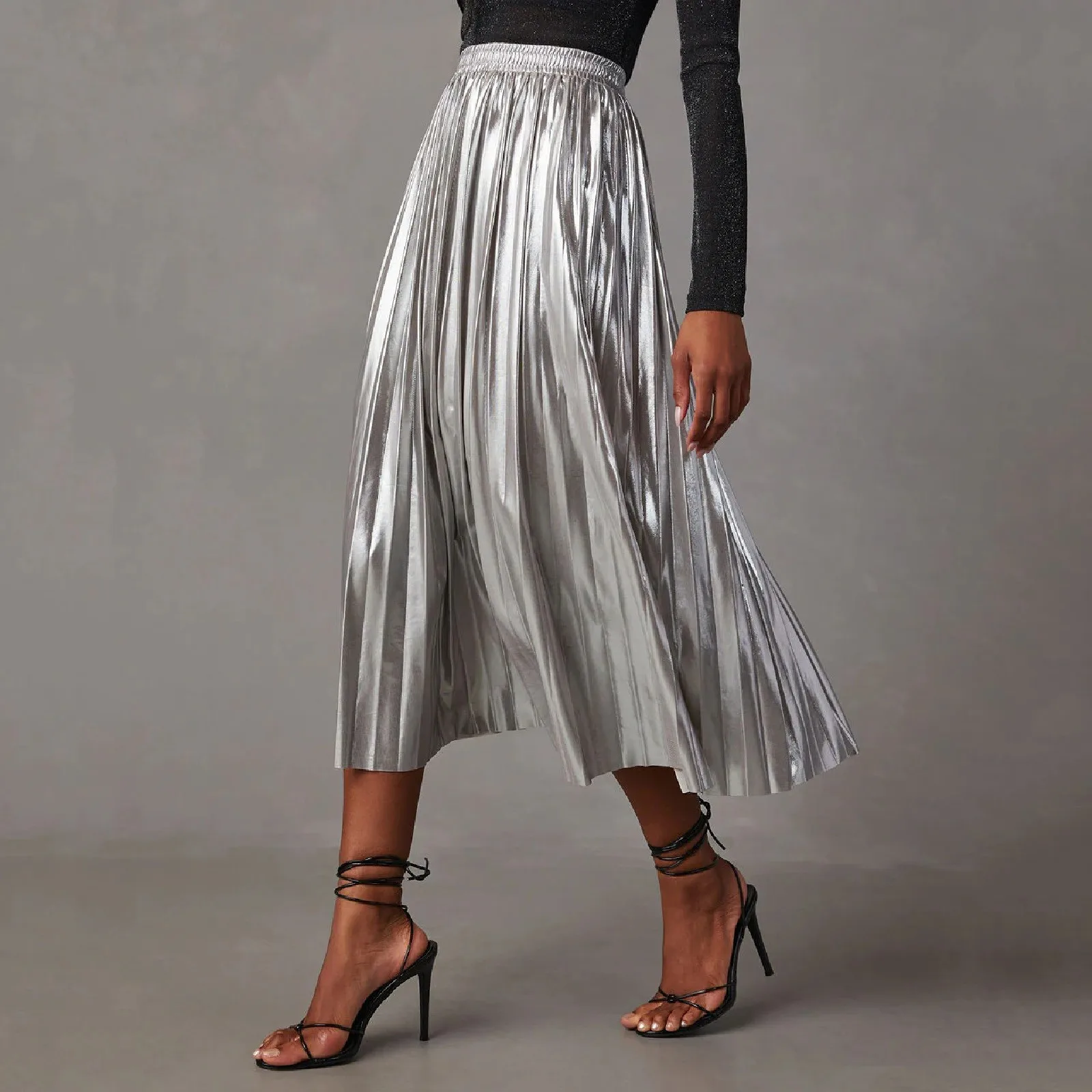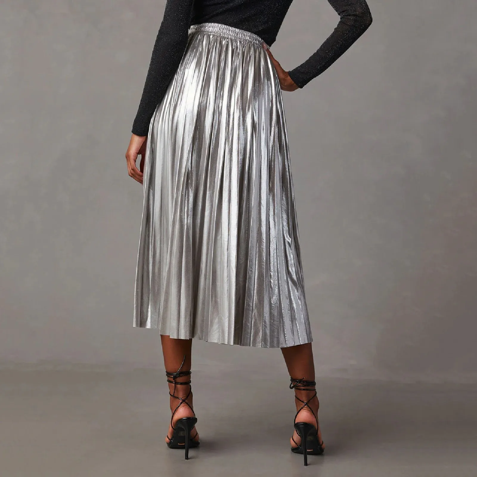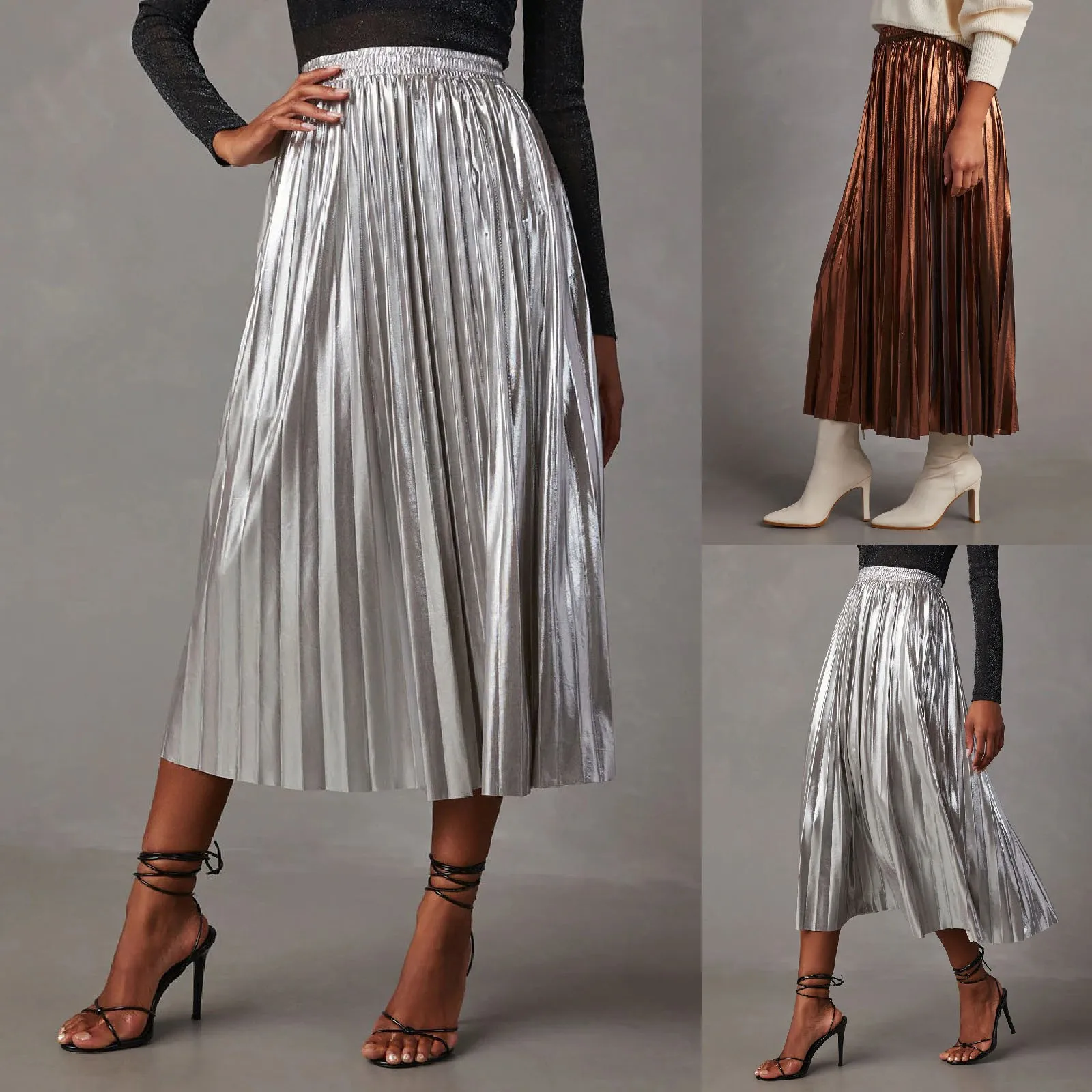 Hot stamping shiny silver pleated skirt high waist A-line pleated skirt